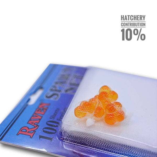 Raven Spawn Net is conveniently pre-cut in 3” X 3” squares and ready for tying. The super soft netting material gently molds around roe to make a perfect spawn bag every time. Raven Spawn Net works great for virtually any soft baits including salmon roe, mussels, corn, shrimp, worms, paste and cheese. Packaged in re-closable packs of 100 pieces.